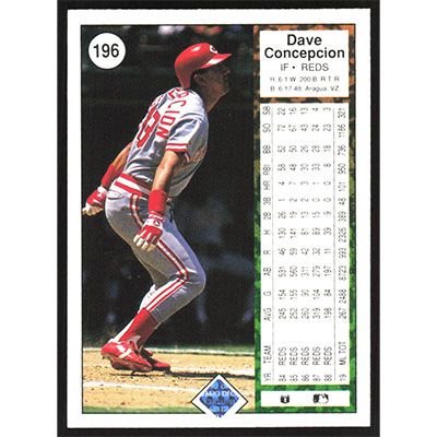 This is a 1989 Upper Deck Dave Concepcion baseball card. The card is #196 and pictures show condition.