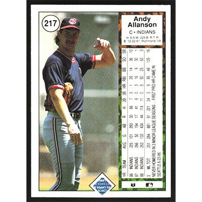 This is a 1989 Upper Deck Andy Allanson baseball card. The card is #217 and pictures show condition.