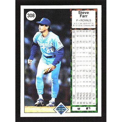 This is a 1989 Upper Deck Steve Farr baseball card. The card is #308 and pictures show condition.