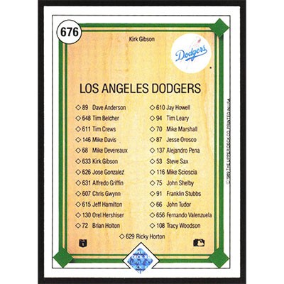 This is a 1989 Upper Deck Kirk Gibson Team Checklist baseball card. The card is #676 and pictures show condition.
