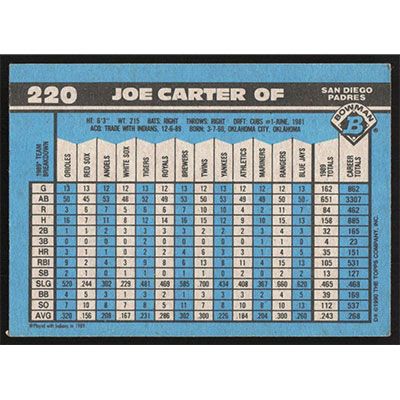 This is a 1990 Bowman Joe Carter baseball card. The card is #220 and pictures show condition.