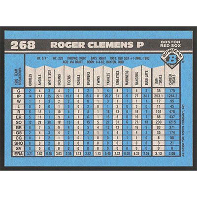 This is a 1990 Bowman Roger Clemens baseball card. The card is #268 and pictures show condition.