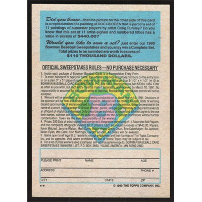 This is a 1990 Bowman Art Inserts Dwight Gooden baseball card. The card is #NNO and pictures show condition.