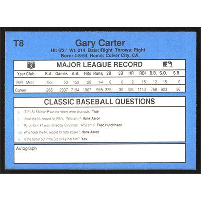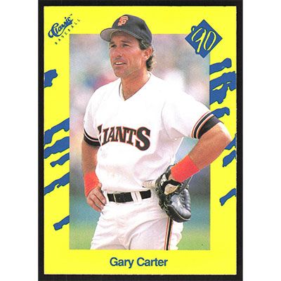 This is a 1990 Classic Yellow Gary Carter baseball card. The card is #T8 and pictures show condition.