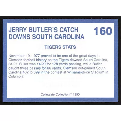 This is a 1990 Clemson Collegiate Collection Jerry Butler football card. The card is #160 and pictures show condition.