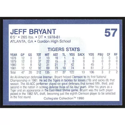 This is a 1990 Clemson Collegiate Collection Jeff Bryant football card. The card is #57 and pictures show condition.