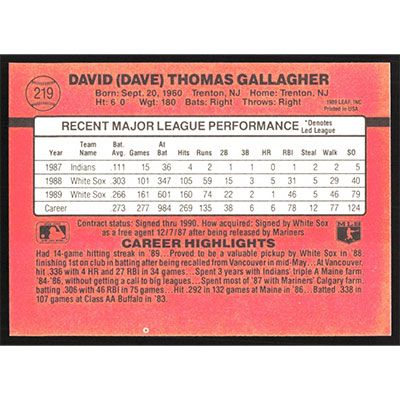 This is a 1990 Donruss Dave Gallagher baseball card. The card is #219 and pictures show condition.
