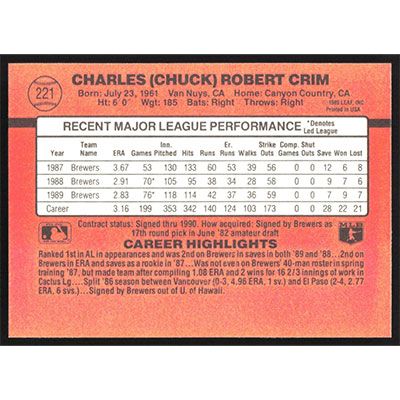 This is a 1990 Donruss Chuck Crim baseball card. The card is #221 and pictures show condition.