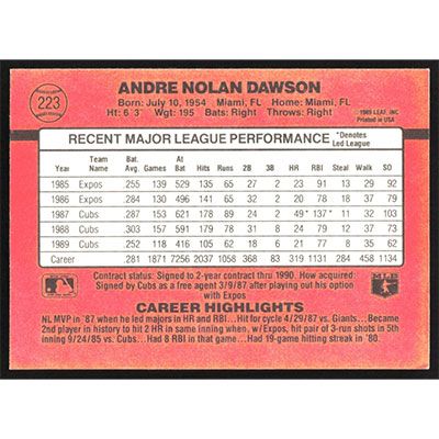 This is a 1990 Donruss Andre Dawson baseball card. The card is #223 and pictures show condition.