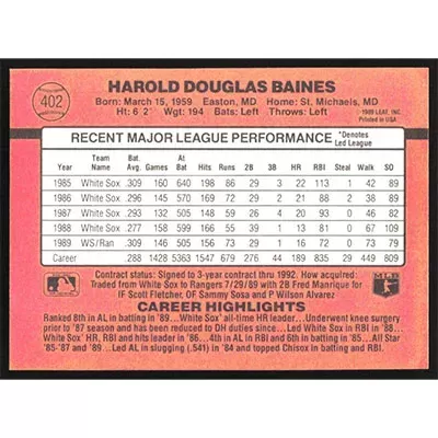 This is a 1990 Donruss Harold Baines baseball card. The card is #402 and pictures show condition.