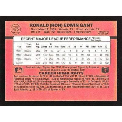This is a 1990 Donruss Ron Gant autographed baseball card. This card has been signed, in blue, by Ron Gant, and is guaranteed authentic by Ballcardz.com. The card is #475 and pictures show condition.