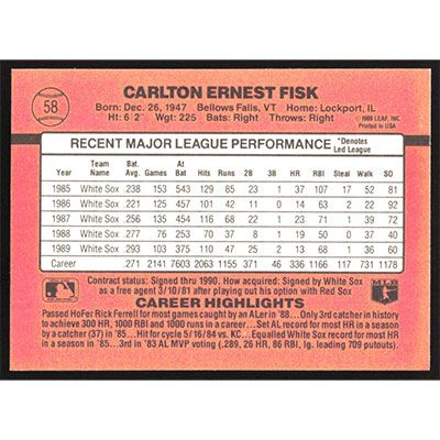 This is a 1990 Donruss Carlton Fisk baseball card. The card is #58 and pictures show condition.