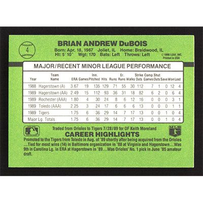 This is a 1990 Donruss Rookies Brian DuBois baseball card. The card is #4 and pictures show condition.
