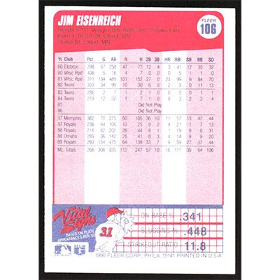 This is a 1990 Fleer Jim Eisenreich baseball card. The card is #106 and pictures show condition.