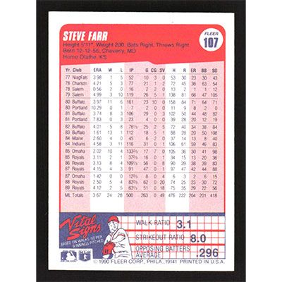 This is a 1990 Fleer Steve Farr baseball card. The card is #107 and pictures show condition.