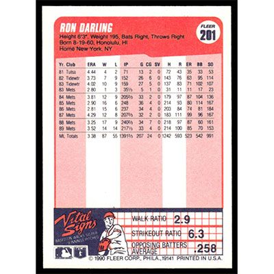 This is a 1990 Fleer Ron Darling baseball card. The card is #201 and pictures show condition.