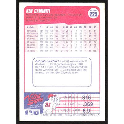 This is a 1990 Fleer Ken Caminiti baseball card. The card is #225 and pictures show condition.