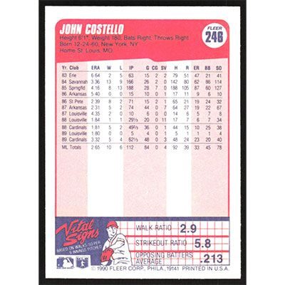 This is a 1990 Fleer John Costello baseball card. The card is #246 and pictures show condition.