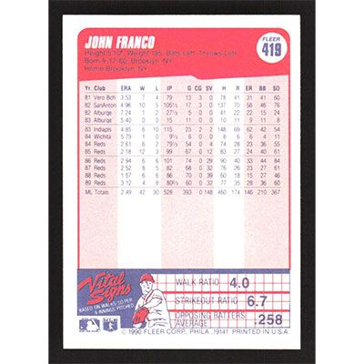 This is a 1990 Fleer John Franco baseball card. The card is #419 and pictures show condition.