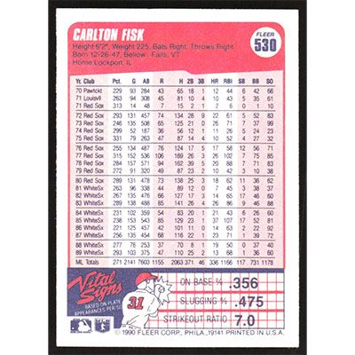 This is a 1990 Fleer Carlton Fisk baseball card. The card is #530 and pictures show condition.