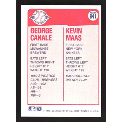 This is a 1990 Fleer George Canale and Kevin Maas Major League Prospects baseball card. The card is #641 and pictures show condition. Team(s): Milwaukee Brewers/New York Yankees Rookie Card (RC)