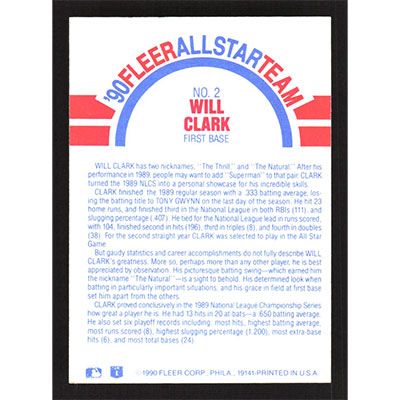 This is a 1990 Fleer All-Stars Will Clark baseball card. The card is #2 and pictures show condition.