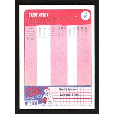 This is a 1990 Fleer Update Steve Avery autographed baseball card. This card has been signed, in blue, by Steve Avery, and is guaranteed authentic by Ballcardz.com. The card is #U-1 and pictures show condition.