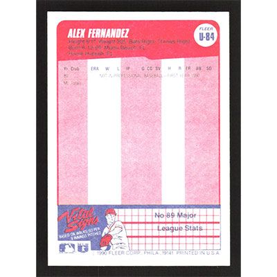 This is a 1990 Fleer Update Alex Fernandez baseball card. The card is #U-84 and pictures show condition. Team(s): Chicago White Sox Rookie Card (RC)