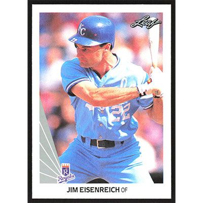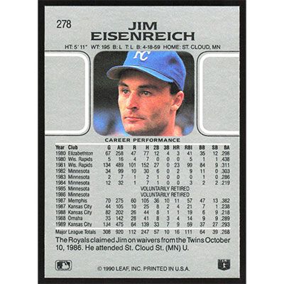 This is a 1990 Leaf Jim Eisenreich baseball card. The card is #278 and pictures show condition.