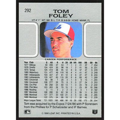 This is a 1990 Leaf Tom Foley baseball card. The card is #292 and pictures show condition.