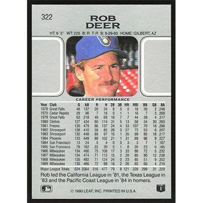 This is a 1990 Leaf Rob Deer baseball card. The card is #322 and pictures show condition.