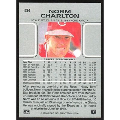 This is a 1990 Leaf Norm Charlton baseball card. The card is #334 and pictures show condition.