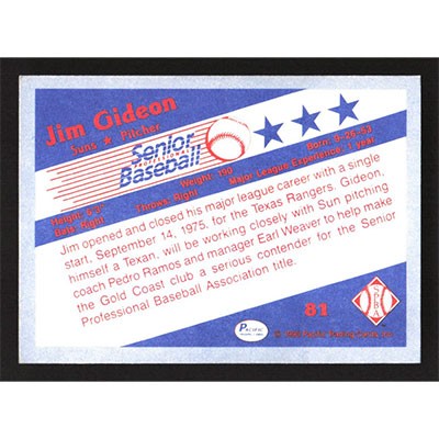This is a 1990 Pacific Senior League Jim Gideon baseball card. The card is #81 and pictures show condition.