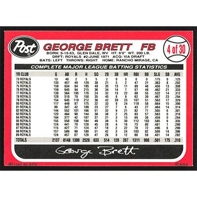 This is a 1990 Post George Brett baseball card. The card is #4 and pictures show condition.