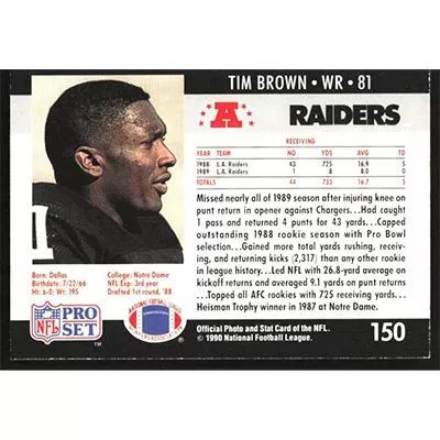 This is a 1990 Pro Set Tim Brown football card. The card is #150 and pictures show condition.