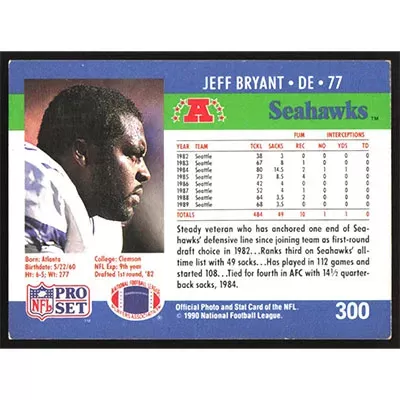 This is a 1990 Pro Set Jeff Bryant football card. The card is #300 and pictures show condition.