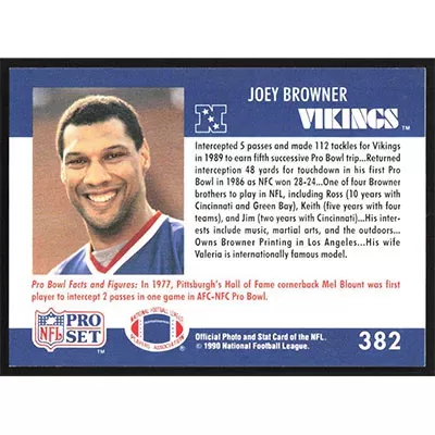 This is a 1990 Pro Set Joey Browner Pro Bowl football card. The card is #382 and pictures show condition.