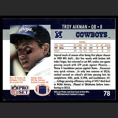 This is a 1990 Pro Set Troy Aikman football card. The card is #78 and is in NM-MT condition.