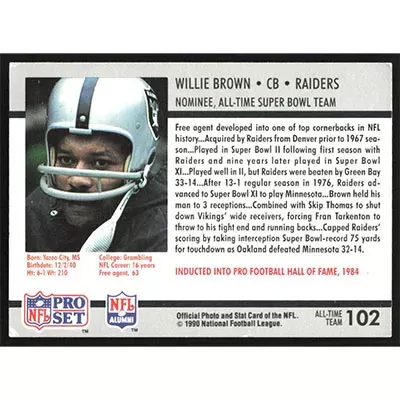 This is a 1990 Pro Set Super Bowl 160 Willie Brown football card. The card is #102 and pictures show condition.