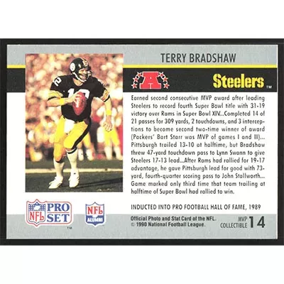 This is a 1990 Pro Set Super Bowl MVPs Terry Bradshaw football card. The card is #14 and pictures show condition.