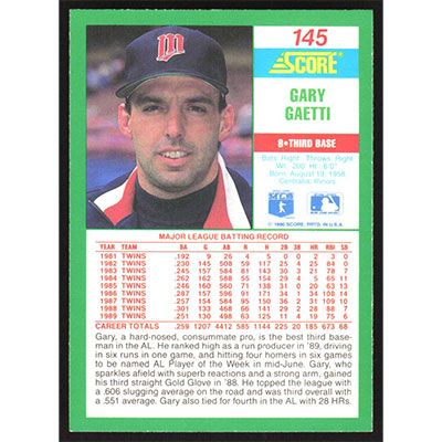 This is a 1990 Score Gary Gaetti baseball card. The card is #145 and pictures show condition.