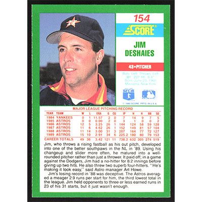 This is a 1990 Score Jim Deshaies baseball card. The card is #154 and pictures show condition.
