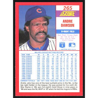 This is a 1990 Score Andre Dawson baseball card. The card is #265 and pictures show condition.