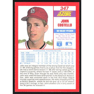 This is a 1990 Score John Costello baseball card. The card is #347 and pictures show condition.