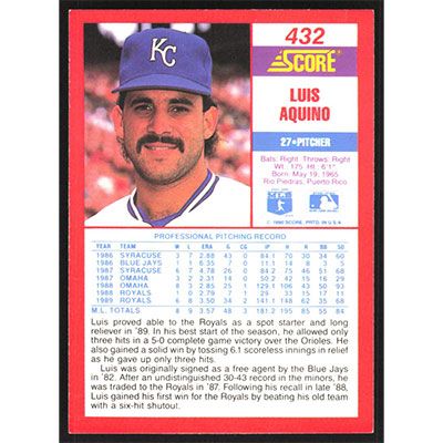 This is a 1990 Score Luis Aquino baseball card. The card is #432 and pictures show condition.