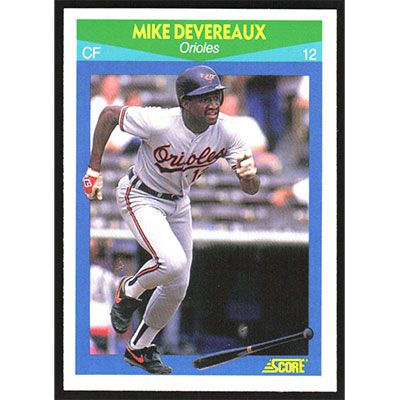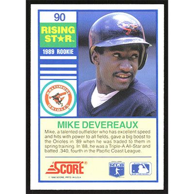 This is a 1990 Score Rising Stars Mike Devereaux baseball card. The card is #90 and pictures show condition.