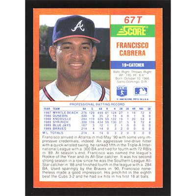This is a 1990 Score Rookie/Traded Francisco Cabrera autographed baseball card. This card has been signed, in blue, by Francisco Cabrera, and is guaranteed authentic by Ballcardz.com. The card is #67T and pictures show condition.