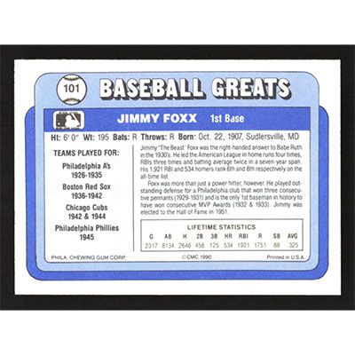 This is a 1990 Swell Baseball Greats Jimmy Foxx baseball card. The card is #101 and pictures show condition.