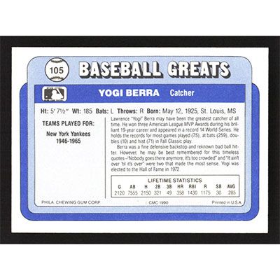 This is a 1990 Swell Baseball Greats Yogi Berra baseball card. The card is #105 and pictures show condition.