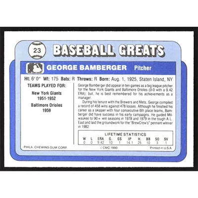 This is a 1990 Swell Baseball Greats George Bamberger baseball card. The card is #23 and pictures show condition.